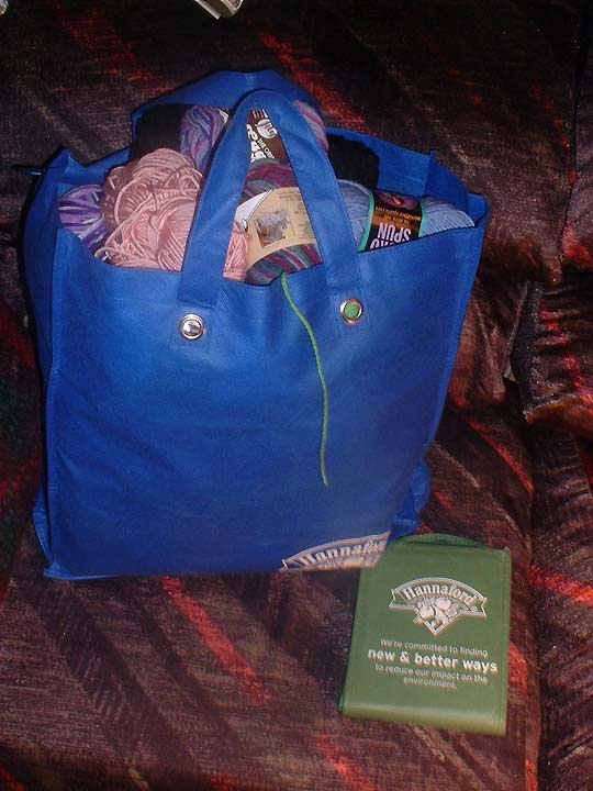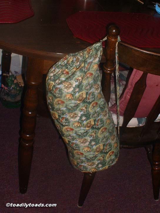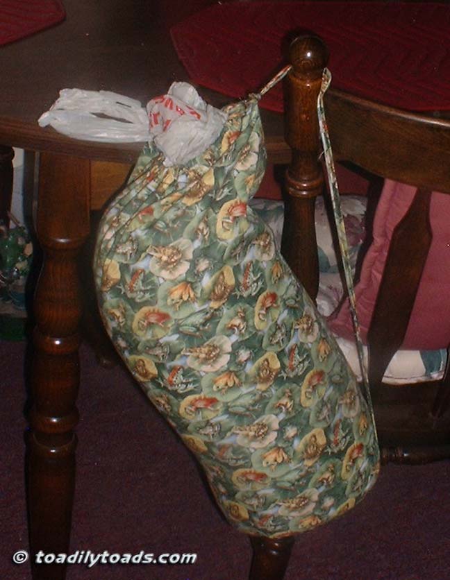 Here we see a great bag available at Hannaford supermarkets (http://www.hannaford.com). Notice how it folds up. When opened, the bottom of the bag is the sides you see one of in this picture. There is a LOT of yarn in this bag! You can fit tons more groceries in one of these than in any plastic bag. Below, see a photo of my hand made solution to reusing plastic bags. This bag dispenser can hold tons of plastic bags neatly and make them easy to recycle and reuse. We mostly use them for garbage bags. We try to avoid plastic all together, but sometimes you will get a few if you run out of cloth bags or if you bring home meat that leaks. If you would like to know more about ordering one of these, come by the toadilytoads free forum and ask.