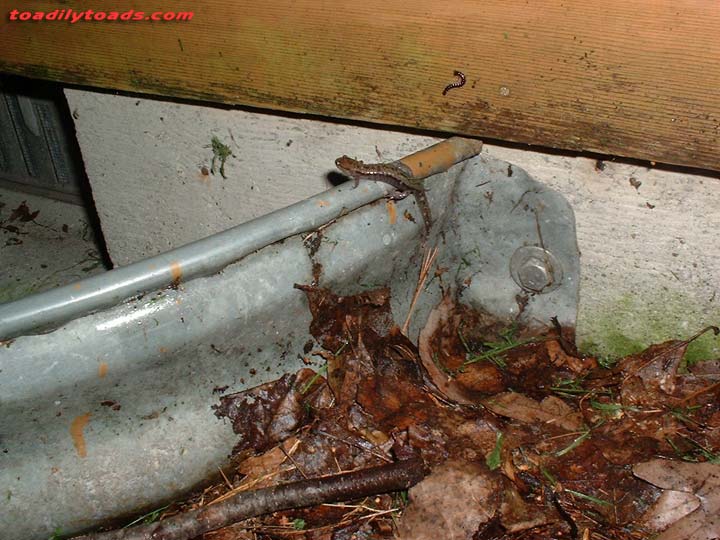 The window well is a popular hang out. Here we see a newt about to leap in. On the wall is a multi-legged insect that is not going to live long in that well.